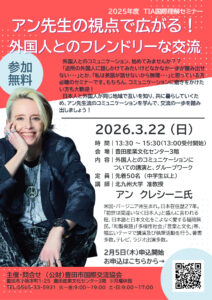 English 中文 Português ワールドツアー in TIA ワールドツアー in TIA 愛・地球博20周年祭”地球大交流フェスタ”出展 とよたSDG’sミライ大学講座"作って食べよう!ブラジルのおかしブリガデイロ" フィリピン・フィエスタ キッズフェスティバル 国際理解セミナー”楽しく学ぼう!世界の食文化” 外国人向けそば打ち体験 英語サロンインド こども国際クラブ ナショナルデータイ インドネシア・インターナショナルフレンドシップデー 若者の国際フォーラム 国際ヨガの日2025 PICK UP イベントTIAカレンダー(教室・イベント等) イベント【申込み2/5~】アン先生の視点で広がる!外国人とのフレンドリーな交流 募集中【受付中】E-IFF英語サロン ”ブラジル人講師による英語での健康講話・体操” 最新情報 ボランティア【募集中】日本語サロン ボランティア募集 日本語教室【うけつけちゅう】にほんごサロン ボランティア【募集中】Alpha日本語教室ボランティア募集 日本語教室【うけつけちゅう】Alpha にほんごきょうしつ ボランティア【3期2026/1/9開始】帰国子女Englishグループ新規受講者募集 日本語教室【うけつけちゅう 】にほんご ドットJP ボランティア【随時募集中】日本語教室ボランティア 日本語教室【うけつけちゅう】にほんごひろば (TIA きょうしつ) 日本語教室【うけつけちゅう】にほんごひろば オンラインきょうしつ 日本語教室【うけつけちゅう】にほんごひろば(わかばやしきょうしつ) 日本語教室【うけつけちゅう】にほんごひろば (たかはしきょうしつ) 日本語教室【うけつけちゅう】にほんごひろば(すえのはら きょうしつ) 日本語教室【うけつけちゅう 】 にほんごドットJP 「すまいる」 NEWS お知らせ一覧 2025/12/24 公益財団法人豊田市国際交流協会と公益財団法人豊田市文化振興財団が合併します 2025/06/11 “TIAレポート2024″が完成しました 2024/04/07 Thời gian mở cửa Trung tâm tư vấn đa ngôn ngữ (Đã có tư vấn bằng tiếng việt) 2024/04/07 多言語相談窓口開設時間について(ベトナム語相談始めました)