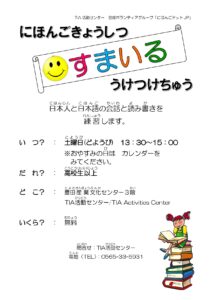 PICK UP イベント【受付中】4/19(日)ニューヨークの”リアル”知っとる?キムさんのNY紹介 募集中【TIAボランティアの皆様ご参加ください!】4/19(日)10:30~ボランティア総会 最新情報 日本語教室【つぎは5/10~】Alpha にほんごきょうしつ 日本語教室【うけつけちゅう 】 にほんごドットJP 「すまいる」 日本語教室【つぎは5がつ13にち~】にほんごサロン TIAについて合併について ボランティア【5月10日開講】帰国子女Englishグループ ボランティア【随時募集中】日本語教室ボランティア 日本語教室【うけつけちゅう 】にほんご ドットJP