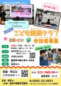 PICK UP イベントTIAカレンダー(教室・イベント等) スタッフ募集とよた日本語学習支援システム システムコーディネータ募集 イベント【受付中】アン先生の視点で広がる!外国人とのフレンドリーな交流 最新情報 募集中【申込み3/31午後5時まで】2026年度こども国際クラブ 参加者募集 ボランティア【募集中】日本語サロン ボランティア募集 日本語教室【うけつけちゅう】にほんごサロン ボランティア【募集中】Alpha日本語教室ボランティア募集 日本語教室【うけつけちゅう】Alpha にほんごきょうしつ ボランティア【3期2026/1/9開始】帰国子女Englishグループ新規受講者募集 日本語教室【うけつけちゅう 】にほんご ドットJP ボランティア【随時募集中】日本語教室ボランティア 日本語教室【うけつけちゅう】にほんごひろば オンラインきょうしつ 日本語教室【うけつけちゅう】にほんごひろば(わかばやしきょうしつ) 日本語教室【うけつけちゅう】にほんごひろば(すえのはら きょうしつ) 日本語教室【うけつけちゅう 】 にほんごドットJP 「すまいる」
