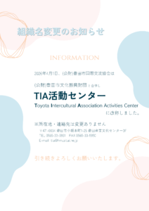 English 中文 Português ワールドツアー in TIA ワールドツアー in TIA 愛・地球博20周年祭”地球大交流フェスタ”出展 とよたSDG’sミライ大学講座"作って食べよう!ブラジルのおかしブリガデイロ" フィリピン・フィエスタ キッズフェスティバル 国際理解セミナー”楽しく学ぼう!世界の食文化” 外国人向けそば打ち体験 英語サロンインド こども国際クラブ ナショナルデータイ インドネシア・インターナショナルフレンドシップデー 若者の国際フォーラム 国際ヨガの日2025 最新情報 TIAについて組織名変更について ボランティア【5月10日開講】帰国子女Englishグループ ボランティア【随時募集中】日本語教室ボランティア 日本語教室【うけつけちゅう 】にほんご ドットJP 日本語教室【うけつけちゅう 】 にほんごドットJP 「すまいる」 NEWS お知らせ一覧 2026/02/03 合併公告 2025/12/24 公益財団法人豊田市国際交流協会と公益財団法人豊田市文化振興財団が合併します 2025/06/11 “TIAレポート2024″が完成しました 2024/04/07 Thời gian mở cửa Trung tâm tư vấn đa ngôn ngữ (Đã có tư vấn bằng tiếng việt)