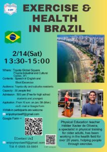 日本語 中文 Português Participants Wanted ホーム Wanted Participants Wanted 【Application starts Jan. 5】English Salon ”EXERCISE & HEALTH IN BRAZIL”