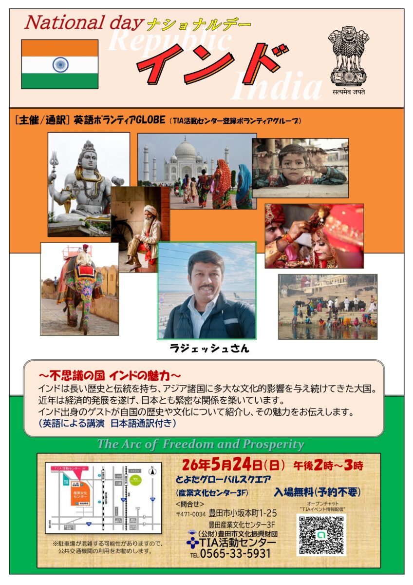English 中文 Português 【5/24(日)14:00~】ナショナルデー「インド」 ホーム イベント 【5/24(日)14:00~】ナショナルデー「インド」 長い歴史と伝統を持ち、アジア諸国に多大な文化的影響を与え続けてきたインド。 講師のラジェッシュさんが、歴史や文化などの紹介を通して、インドの魅力をお伝えします。 (英語講演・日本語通訳あり) 予約不要・入場無料!どなたでもお気軽にご来場ください!