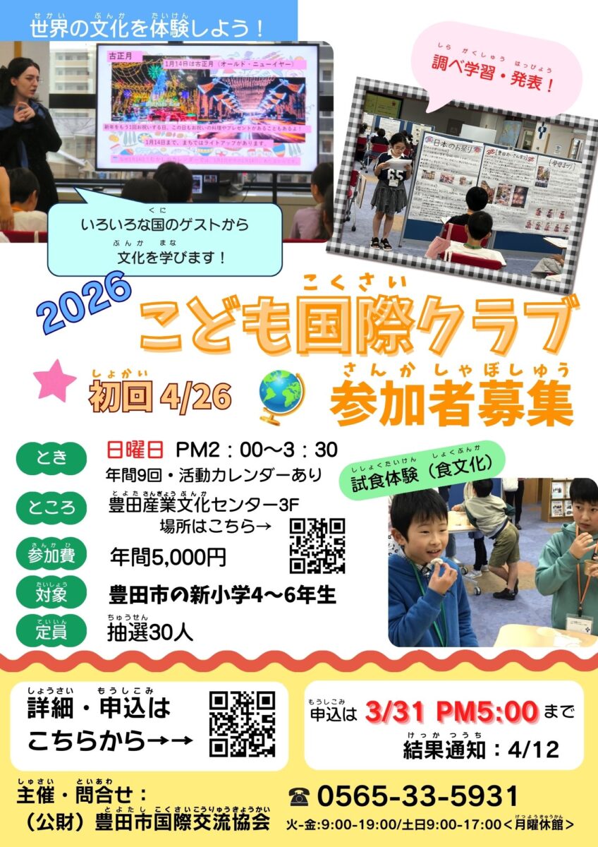 【申込み3/31午後5時まで】2026年度こども国際クラブ 参加者募集